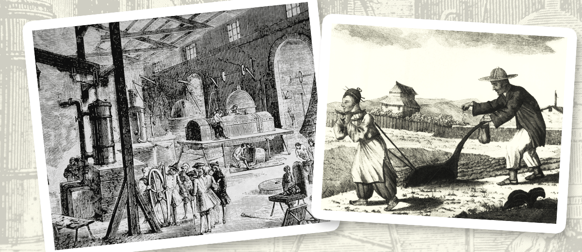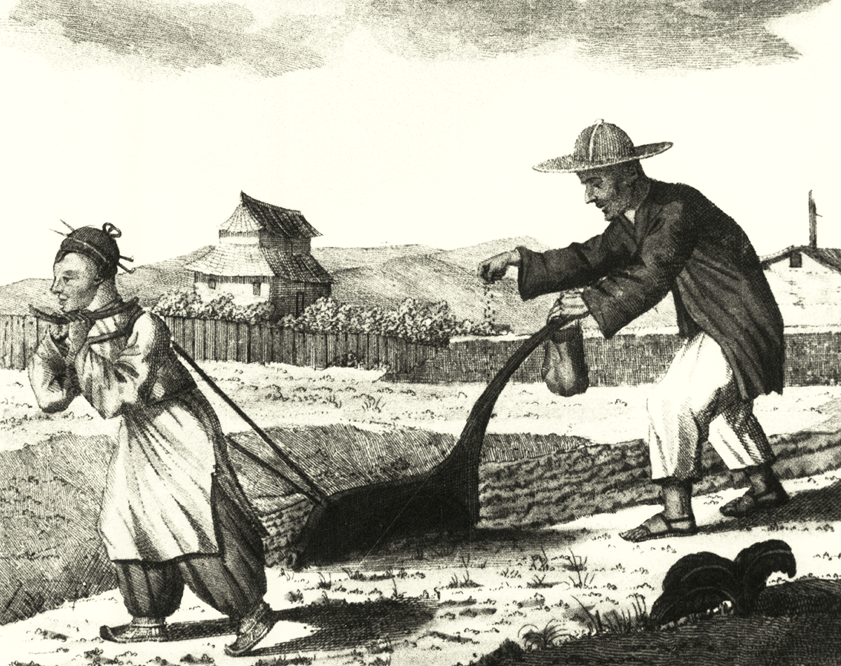 A husband-and-wife team of farmers sowing and working the land with a plough in the late Qing dynasty, illustrated by a Western artist. For thousands of years, Chinese farmers practiced subsistence farming. China’s peasant economy left it lagging far behind Western countries that had already begun the industrialization process.