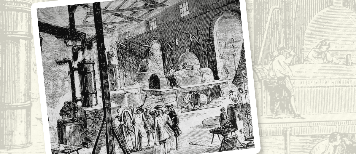 The drawing depicts a British factory during the Victorian era in the 19th century. The Industrial Revolution began in mid-18th century Britain and propelled the West towards rapid advancement in economics, science and technology.