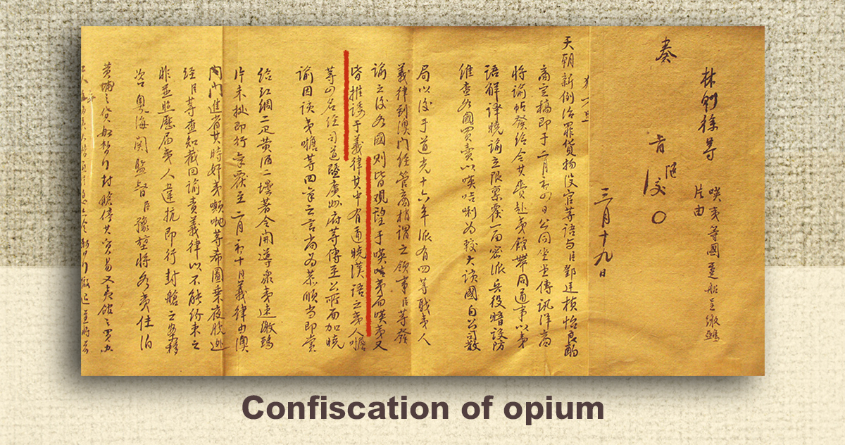 Qing dynasty officials had different opinions about a strict ban on opium. Lin Zexu (林則徐) and Huang Juezi (黃爵滋) were among its proponents. Lin Zexu, the most determined official among them, stressed in a letter to Emperor Daoguang (道光) that “without due action, China will soon have no soldiers to fight for the country and no money to pay for national defence.” In December 1838, Emperor Daoguang promulgated the “Regulations on Banning Opium” and appointed Lin Zexu as Imperial Commissioner for enforcement in the Guangdong area.