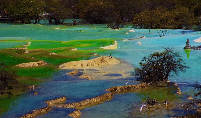 The main landscape of Huanglong (literally “yellow dragon”) in Sichuan is its large-scale, intricately structured and richly colored travertine; it became internationally known because of its rare karst topography. In 1992, both Huanglong and Jiuzhaigou were inscribed on UNESCO’s list of World Heritage Sites.