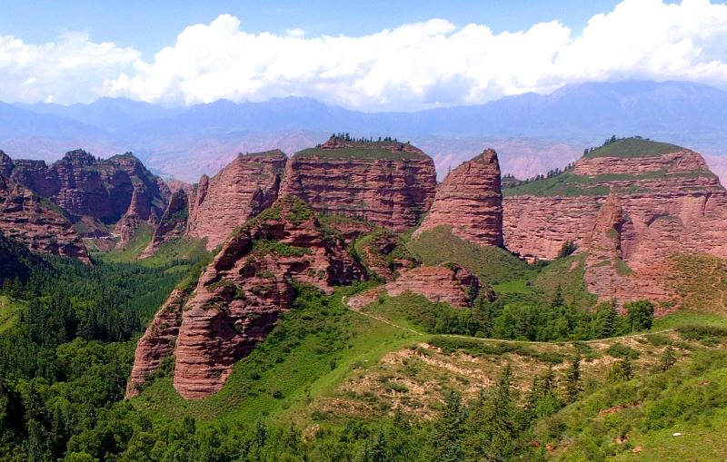 Mount Langshan is representative of the early mature stage dense peak cluster type of Danxia landform. The mountain peaks are dense and stand in great numbers like trees in a forest; they are spectacular. The height difference between the shortest and the tallest peak is 650 meters. This is a magnificent Danxia group landscape composed of dome-shaped Danxia peak clusters. Many unusual landforms have developed in this area including a peculiar Danxia karst formation. The limpid and translucent green Fuyi River zigzags its way through this scenic area—a perfect combination of red mountains and green water, and a rare Danxia scenic area with natural beauty.