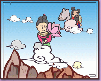 何仙姑本名何瑞蕊,為何員外的獨生女,潛心學道,總不嫁人。後來何瑞蕊見父母常為其婚事操心,故答應招贅,並寫出古怪的招親告示:「男子文才要高,人品要好;貧富不嫌,年紀要老。」七仙看到這文告,見何瑞蕊一片誠心修道,讓年紀最大的張果老扮作老富翁度她成仙。何員外無可挑剔老富翁的文才,但仍嫌他太老,怕日後成為笑柄。於是,師爺建議弄死老富翁。新婚當晚,老富翁於鍋中沐浴時,師爺聲稱加熱水溫,打算悶死老富翁。過了很久,師爺以為老富翁已死,假意問道:「水還要加熱嗎?」豈料老富翁答道:「水不太燙,還要加熱。」師爺嚇呆了,立即打開氣蓋,老富翁竟變為美少年。何員外見狀,忙叫小姐拜堂。但何瑞蕊聽說老富翁變為美少年,即不肯出嫁。美少年即在房外喊道:「是福不是禍,是禍躲不過。」何瑞蕊深感此人不簡單,打算進了洞房再作查究。美少年進房後便道明來意,二人決定明為夫妻,暗為師徒,每天潛心修道。幾年後,何員外夫婦去世,何瑞蕊便隨張果老成仙。八仙從此誕生,何仙姑常手拿荷花,以紀念父親(「荷花」即「何」姓之意)。