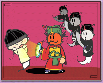 鍾馗是唐朝時的秀才,天生貌醜,為人正直。後來他赴京考科舉,但因考官見其貌醜,最終不中舉,他憤然撞柱身亡,其靈魂飄飄蕩蕩來到地府,閻羅王看見鍾馗,不但沒有嫌棄他,反而十分高興地說:「太好了!我正需要一個正直的人替我到人間捉鬼,你來得正合時。」鍾馗十分感動。閻羅王隨即給鍾馗一本鬼簿,裡面寫上各種鬼擾亂人間的紀錄,並賜他一把神劍及一隊鬼兵,讓他到人間掃蕩眾鬼。
