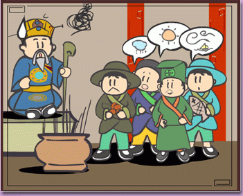 第一位是一位農婦,她祈求天降甘霖,解除乾旱之苦。第二位是一位藥商,他請求晴天烈日,以便曬藥。第三位是漁夫,他祈求起東南風,以助揚帆出海捕魚。第四位是果農,他懇求不要颳風,以免吹走他所種的龍眼。
